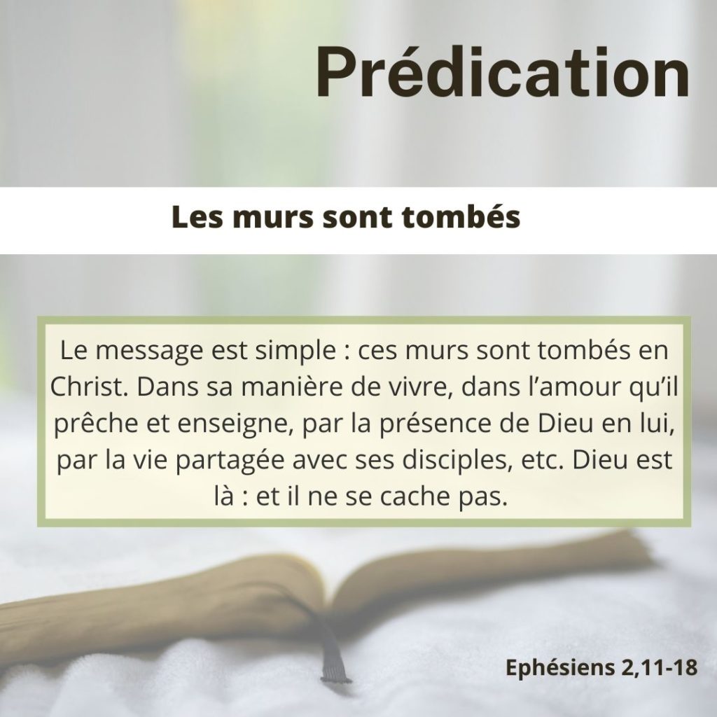 Et pourtant, à nouveau, le message est simple : ces murs sont tombés en Christ. Dans sa manière de vivre, dans l’amour qu’il prêche et enseigne, par la présence de Dieu en lui, par la vie partagée avec ses disciples, etc. Dieu est là : et il ne se cache pas.